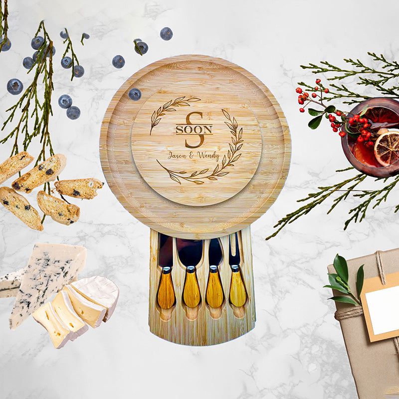 A beautifully crafted wooden cheeseboard set that comes with a built-in knife drawer and serving tools. Perfect for housewarmings, weddings, or special gifts. Add a custom name or design to make it uniquely yours. Elegant, practical, and ideal for any celebration.